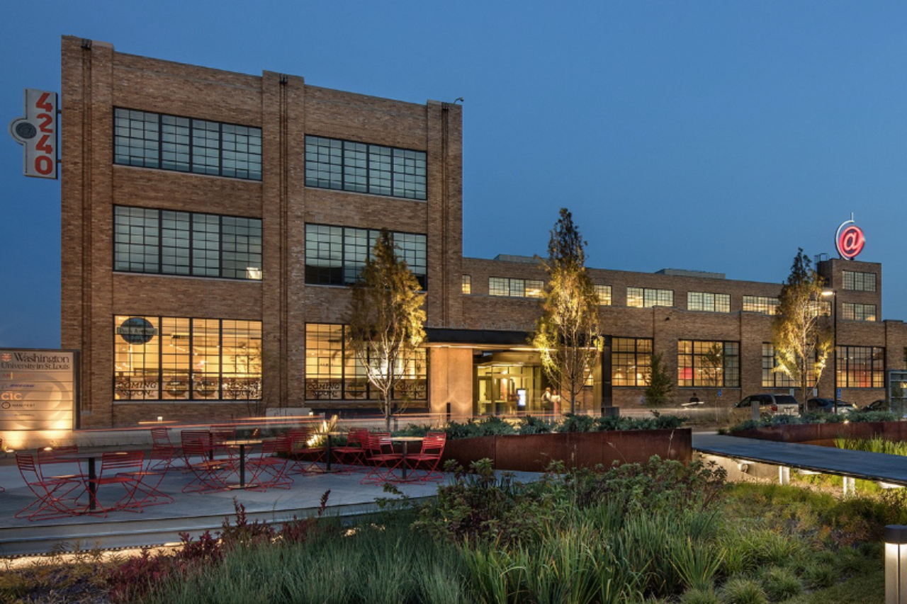 @4240 Duncan is the anchor office building for the Cortex Innovation District. Constructed in 1947 as a telephone assembly warehouse and listed on the National Register, the building was renovated in 2015. The project team worked to preserve the history and character of the original structure while converting it to high-performance multi-tenant lab and office facility. @4240 Duncan received LEED Platinum certification in 2014 for its use of renewable building materials and energy efficiency measures, including a solar array.